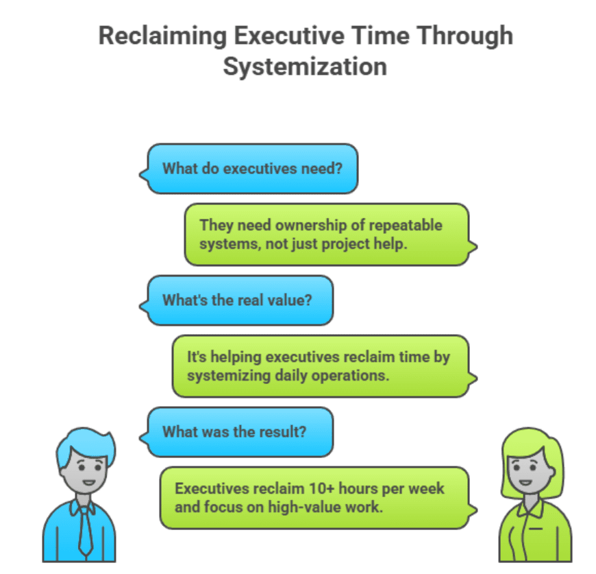 After reading Dan Martell’s “Buy Back Your Time,” Kayla had a realization that would transform not just Execla, but the lives of every executive we’d serve from that point forward. The problem wasn’t that executives needed more help with projects; they needed to reclaim their time through repeatable systems management.