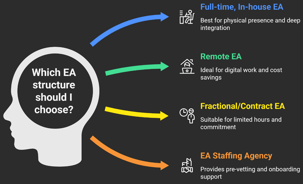 Full-time, in-house EA works when you need physical presence, office management, events, document handling. Highest cost, deepest integration.