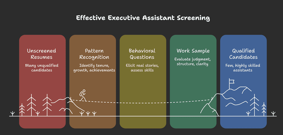 When screening resumes, look for patterns. Multi-year tenure with past executives shows staying power. Increasing responsibility shows growth. Concrete achievements like “reduced executive meeting load by twenty percent while improving satisfaction” show impact.